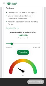 Het systeem om je te verleiden tot een upgrade van stoel kent vele e-mails. Je kunt vooraf bieden via een vereenvoudigd versie van een e-auction. Het dashboard toont of je met je zorgvuldig gekozen bod ook maar enigszins kans maakt op business of first class. De start prijs was 860 dollar pp en dan nog geen garantie dat je nog steeds naast elkaar zit.