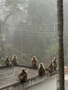 Even later, in een halfslachtige poging tot nog wat slaap, een enorme herrie. Dat wil zeggen, een extra geluid naast de diversiteit van de standaard ochtend geluiden. Opstartende (of niet startende) brommers, blaffende honden, kwetterende vogels, fietsende verkopers die repeterend hun waar aanprijzen en drukke conversaties door hen die waarschijnlijk wèl om 10 uur in bed lagen. Nee, dit was anders. Dit was dezelfde kolonie apen en een stuk of wat honden die met veel kabaal op het hek afstuiven. Althans, dit zie ik terwijl ik weer naar buiten gluur. Er staat een man aan de buitenzijde van het hek, inmiddels volledig omringd. Hij heeft zichzelf blijkbaar de taak toebedeeld om de menigte apen en honden van koekjes te voorzien. Het valt mee dat er geen koeien in beeld zijn, die vinden het mogelijk nog wat te vroeg. Vind ik ook, maar er is niets meer aan te doen en dus zit ik in alle vroegte op ons balkonnetje aan de voorzijde. Beveiligd door tralies, een heerlijke frisse ochtend geur en warme Tulsi thee in m’n handen. Wat een luxe, zo’n heel appartement voor onszelf in een relatief groene wijk – Kalyani Ghospara. Ergens in de verte wordt er een tempel ritueel uitgevoerd en terwijl ik dit schrijf passeert een oudere man op een fiets met een luid klinkende muziek box op zijn bagagedrager. Zelfs ik hoor dat het geen JBL of Tannoy is, hij lijkt er echter content mee. Ook onze lieve caretaker Bhulida is al vroeg op en druk in de weer. Eigenlijk slaapt hier niemand uit. Ook wij dus niet, dat is simpelweg onmogelijk. Het verschil is echter dat wij gewoon rustig wakker kunnen worden zonder ook maar iets te moeten of te moeten verkopen. En terwijl wij de temperatuur heerlijk vinden – op dit vroege tijdstip nog net geen 20 graden – vinden de bewoners het overduidelijk echt koud. Alle passanten zijn dik ingepakt met muts, sjaals en vaak een kleurige deken.