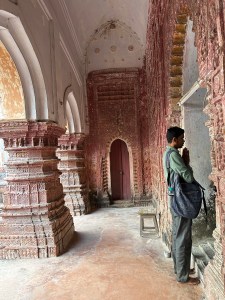 Overdag hebben we hier de afgelopen twee dagen een auto met chauffeur gehuurd en zijn we de West Bengaalse terracotta tempels gaan opzoeken. Dat laatste kan zeker letterlijk worden opgevat. Onze chauffeur Bablu, reeds jaren de steun en toeverlaat van onze Airbnb host, weet vast en zeker de standaard plaatsen in de omgeving, maar de pareltjes die wij via allerhande blogs gevonden hadden zijn duidelijk niet standaard. Althans, niet voor hem. Ook is zijn kennis van de Engelse taal zeer beperkt en Google maps gebruikt hij niet. Wèl laat hij z’n huis, vrouw en winkeltje zien. Natuurlijk moet er ook nog getankt worden – want waarom dit vooraf doen? – maar dan zijn we ook echt onderweg.