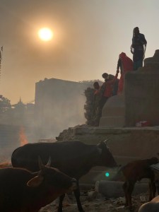 Als je één wordt met de rivier die door de godin Ganga wordt beschermd, dan wacht de verlichting; moksha. Weg van het aardse leven. Volgens de legende stak Mati Sati, de godin van het huwelijk, zichzelf in brand. Wat haar tot die daad dreef vertelt internet me helaas niet, maar ik lees wel dat haar man Shiva haar brandende lichaam naar de witte toppen van de Himalaya bracht. Tijdens deze mooie en liefdevolle ‘evacuatie actie’ viel echter haar oorhanger uit haar oor en deze belandde precies daar waar we gisteren stonden. Op de versleten trappen van de Manikarnika Ghat. Manikarni is oorhanger in het Sanskriet, zie hier de logica. De oorhangertrappen dus. Daar waar nu, reeds duizenden jaren lang, lichamen verbrand worden zodat de as uitgestrooid kan worden in de rivier.
