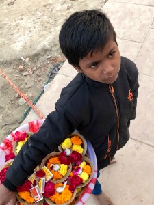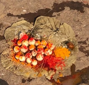 Einde dag besluiten we te blijven hangen bij de Dashashwamedh Ghat, daar waar Brahma tien (das) paarden (aswa) heeft geofferd (mesh). Hier wordt de meest uitgebreide aarthi ceremonie uitgevoerd. Elke avond om zeven uur, in de winter zes uur. We hebben een mooi plekje gevonden, bovenop op een oude houten tafel, midden tussen de massa. Het is ons inmiddels duidelijk dat tegen zonsondergang alle wegen naar de Dashashwamedh ghat leiden. Ongelofelijk hoeveel mensen er zijn, en dat dus iedere dag. Het is een avondritueel waarbij priesters vuurlichten aanbieden aan de rivier, vergezeld van gezangen en gebeden. Een spirituele ceremonie van aanbidding waarvoor mensen blijkbaar uren willen wachten. Op de andere avonden zien we dat er bij diverse andere ghats een gelijk ritueel plaatsvindt. Minder groots en vooral… minder druk. Na afloop is het een optocht van boten. In file komen ze voorbij, variërend van kleine roeibootjes tot helverlichte dubbeldeks. Maar het leukste vind ik de brandende lichtjes die op het water drijven, de Diya’s. Een bakje gevuld met ghee met een lontje en wat bloemetjes. Terwijl wij heerlijk op ons balkon genieten van een lassi drijven ze voorbij, beschenen door een mooie ronde volle maan.
