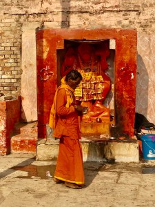 Het stikt er ook van de yoga scholen, althans, dat staat op de beschilderde muren. Ik kan me er weinig bij voorstellen en voel eerlijk gezegd geen enkele aandrang tot Pranayama in deze omgeving. Het is ook zo tegenstrijdig is met de drukte en chaos van de stad zelf. Riksja’s, scooters, koeien, transportkarren, voetgangers. Hemelsbreed zo dichtbij de ghats. De smalle steegjes, daar waar de zon nauwelijks doorkomt. Daar waar je verdwaald. Ik ben blij met ons balkonnetje, met de (relatieve) stilte. Zen zonder yoga dus.