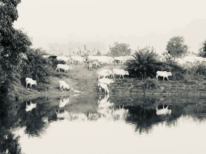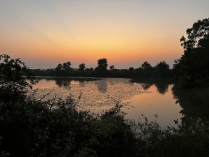 Ik loop hier nog maar eens een rondje om de vijvers nabij het huis. Het is geen slangenseizoen, iets wat het voor mij een stuk aangenamer maakt. Aan de overkant wordt de was gedaan, kleurige doeken liggen te drogen in de laatste zonnestralen. We hebben geluk. Sophie, de Engelse schrijfster en tijdelijke bewoonster van de andere toren kamer, zei dat het de afgelopen drie dagen non stop geregend heeft. Nu echter heerlijk. De dikke muren houden de warmte goed buiten, al schijnt het in de zomer wel een ander verhaal te zijn. Er hangen niet voor niets overal grote plafond ventilatoren.