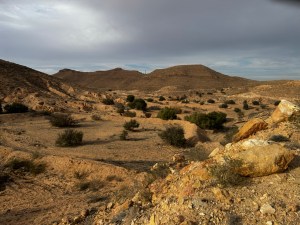 Eenmaal het stadje uit rijden we direct de stilte in. Niemand lijkt interesse te hebben in het ruigere Dahar-gebergte en we belanden al snel in een desolaat maanlandschap van bruine en okergele heuvels.