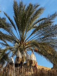 Ik neem me voor nooit meer te klagen over de prijs van dadels. Wanneer ik ze de eerstvolgende keer in Nederland koop, dan denk ik terug aan wat ik hier heb geleerd. Namelijk dat dadelpalmen niet door insecten worden bestoven, maar door de mens. In de lente klimmen mannen met een plukje mannelijk stuifmeel elke vrouwelijke boom in om de bloemen handmatig te bevruchten. Dat is pas seizoenarbeid…